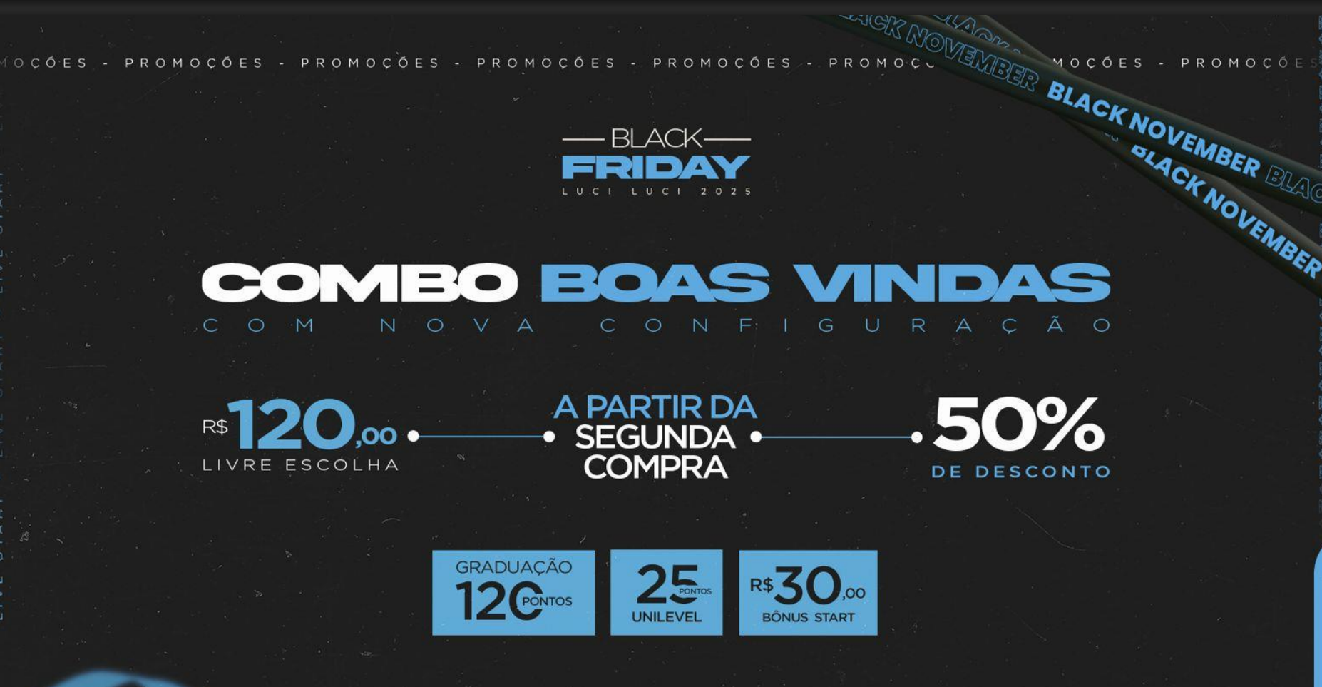 A partir da segunda em diante terá 50% de desconto em qualquer produto Luci Luci.